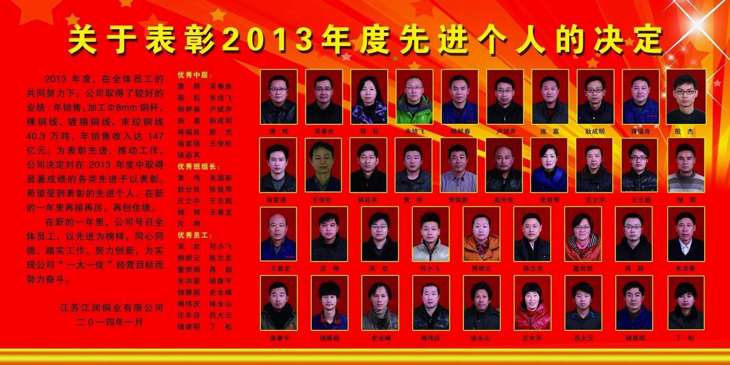 2013年度,在全體員工的共同努力下,公司取得了較好的業(yè)績:年銷售、加工Φ8mm銅桿、裸銅線、鍍錫銅線、束絞銅線40.3萬噸,年銷售收入達147億元。為表彰先進,推動工作,公司決定對在2013年度中取得顯著成績的各類先進予以表彰。希望受到表彰的先進個人,在新的一年里再接再厲,再創(chuàng)佳績。在新的一年里,公司號召全體員工,以先進為榜樣,同心同德、踏實工作、努力創(chuàng)新,為實現(xiàn)公司“一大一佳”經(jīng)營目標而努力奮斗。優(yōu)秀中層:唐 輝、吳春良、駱 耘、朱培飛、楊鮮春、盧斌聲、施 嘉、耿成明、蔣福良殷 杰、駱富強、王俊松、駱品其優(yōu)秀班組長:黃 偉、朱國新、趙分良、張益琴、莊立中、王志超、儲 輝、王春龍、沈 翔優(yōu)秀員工:吳 歡、符小飛、柳嬌云、陳志忠、董麗娟、蔣 超、朱洪星、駱康平、儲滕超史全峰、梅偉慶、徐永山、莊年芬、呂大云、儲建明、丁 松
